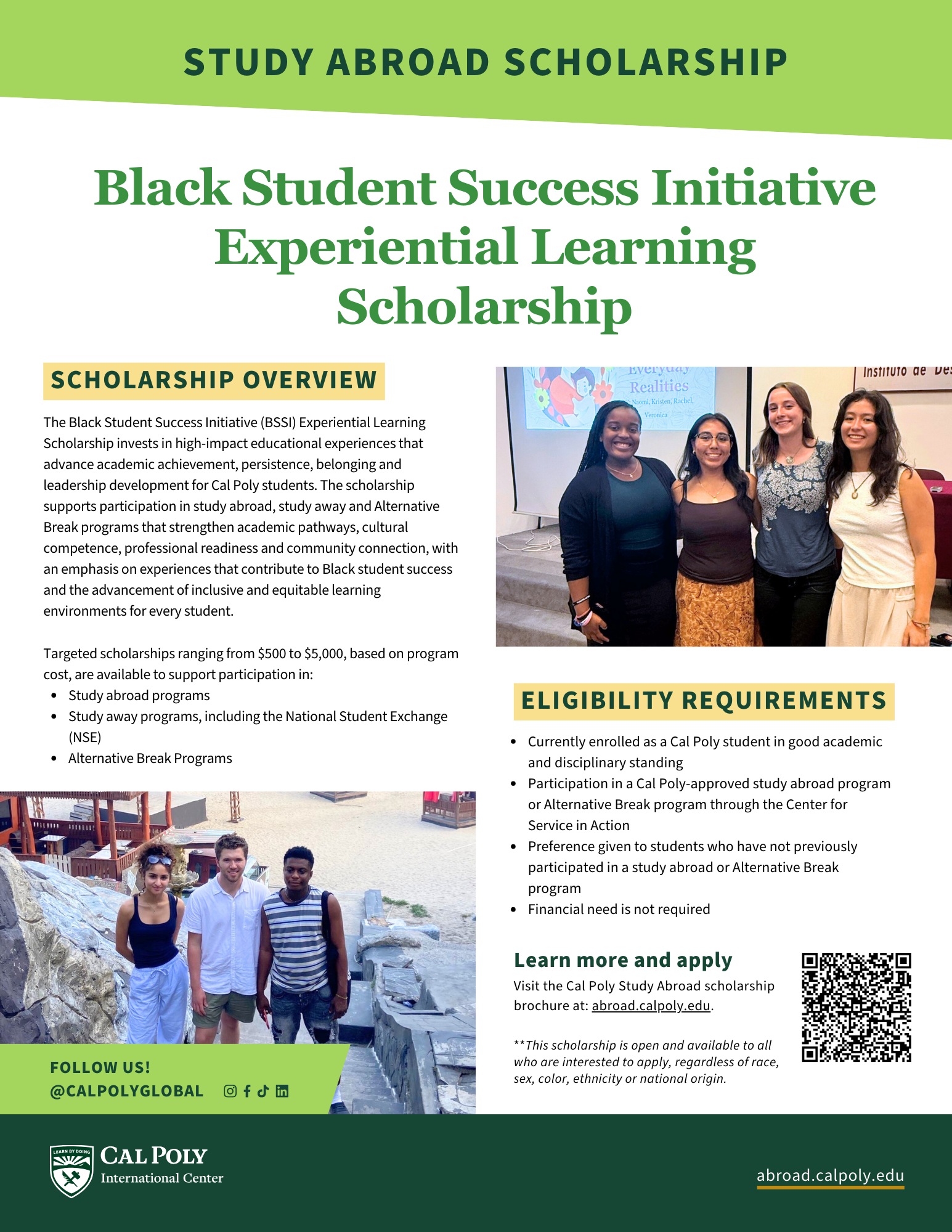 Additional $500-$1500 in funding possible from the Black Student Success Initiative Scholarship through Cal Poly's International Center. For more information, please review this brochure.